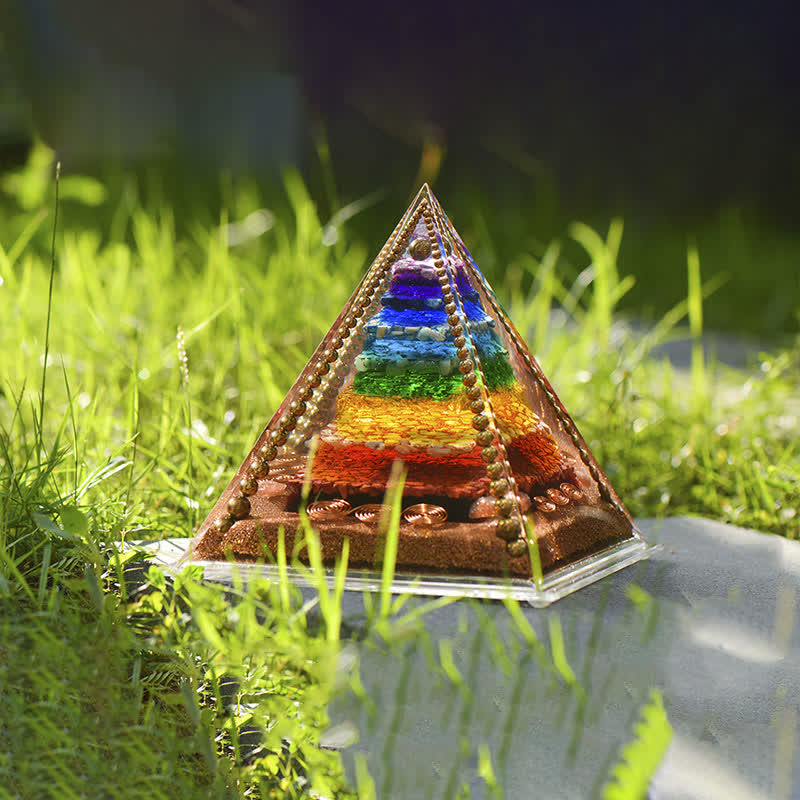 Chakra Energy orgone pyramid integrates seven colorful Chakra stones in ascending layers, symbolizing energy alignment and spiritual harmony. Each base side features three copper coils, amplifying energy flow and balance. This pyramid is thoughtfully crafted to create a calming environment, ideal for meditation or energy-focused practices. It promotes mindfulness, grounding, and alignment in your space.