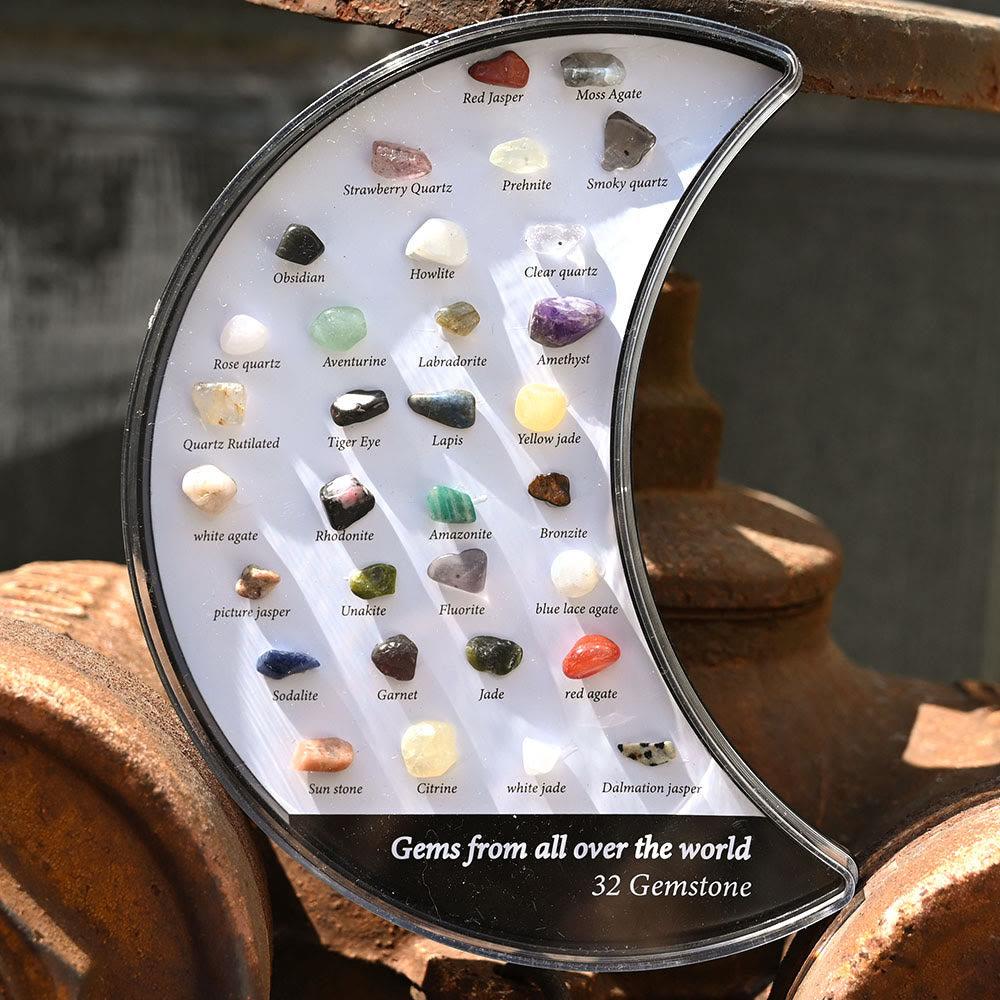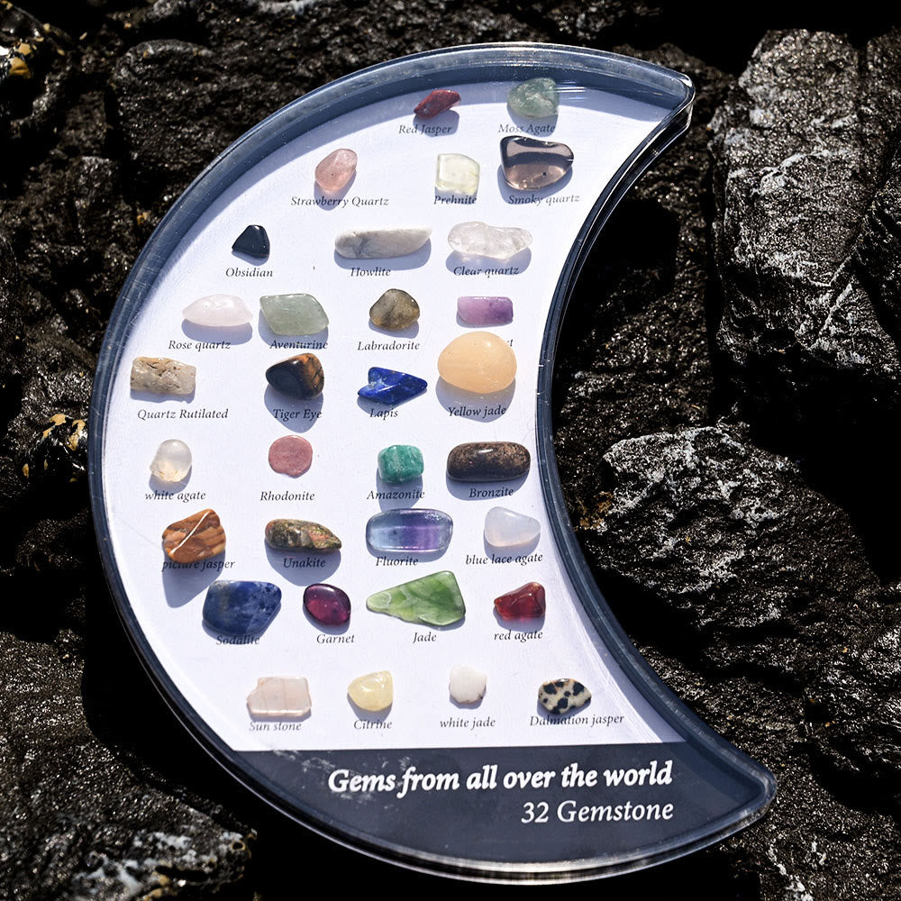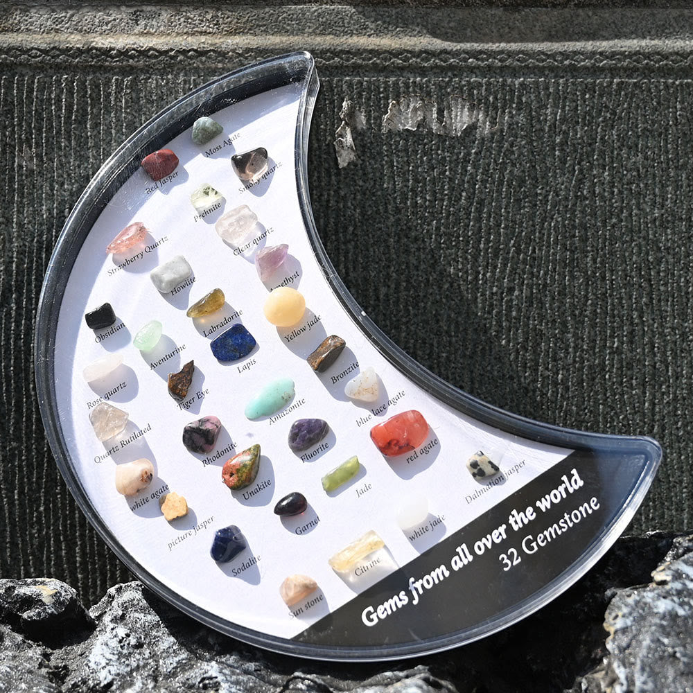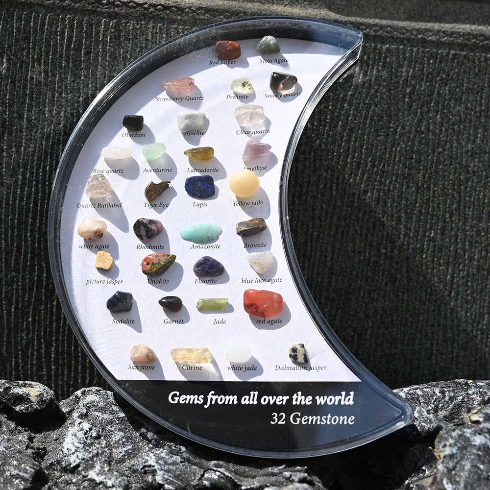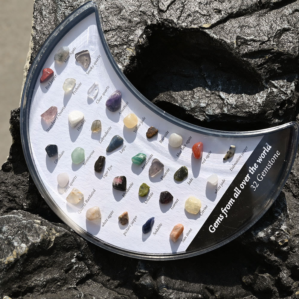 32 Mineral Specimens Moon Set gemstone decoration presents a stunning collection of 32 unique mineral specimens arranged in a crescent moon shape. Each mineral is known for its healing properties, promoting emotional balance, spiritual growth, and overall well-being. The moon shape enhances the energy flow, creating a peaceful and harmonious atmosphere in any space, making it perfect for meditation or energy work.