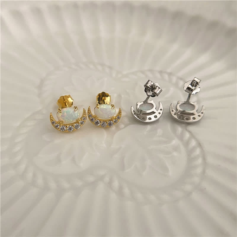 Silver Crescent Moon earrings display a mesmerizing opal gemstone, its iridescent colors reminiscent of the moon's ethereal glow. The gemstone is delicately held by a crescent moon-shaped frame, adorned with sparkling white zircons. Crafted in 925 sterling silver, these earrings embody elegance and spiritual connection, inviting harmony and inner peace.