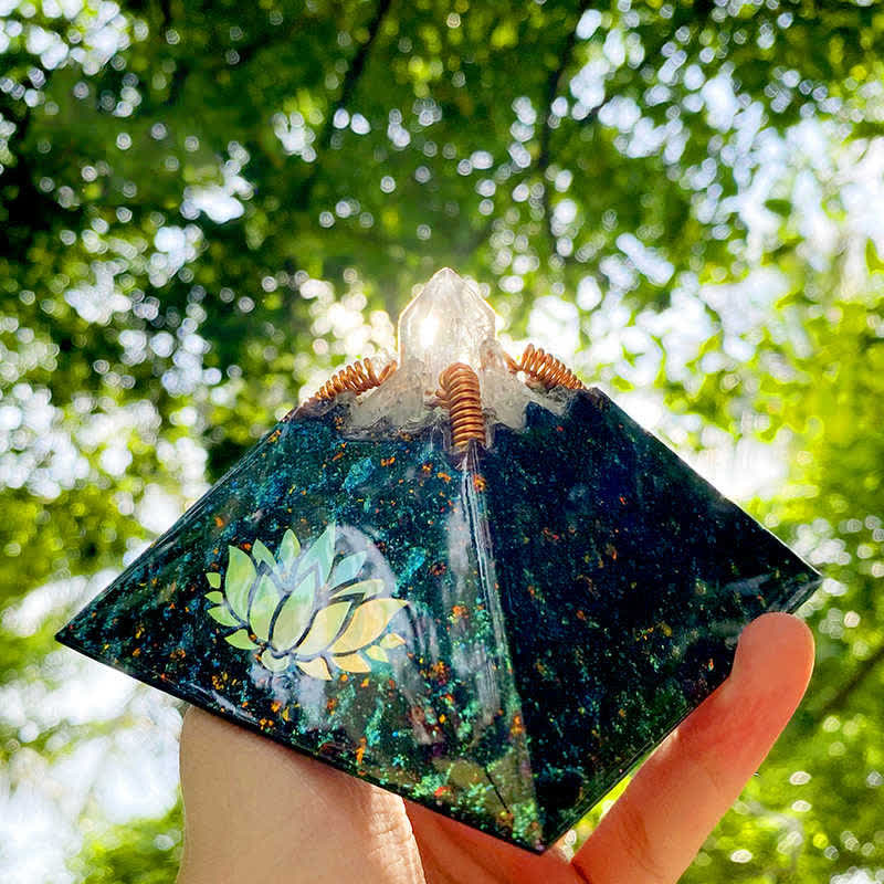 Lotus Crystal orgone pyramid integrates Clear Crystal for amplifying energy, Clear Quartz for clarity, and Hematite for grounding and protection. The lotus design symbolizes purity and spiritual enlightenment, making this pyramid ideal for energy alignment and creating a tranquil space. Crafted with care, it provides a calming atmosphere, supporting mindfulness and meditative practices in any environment.