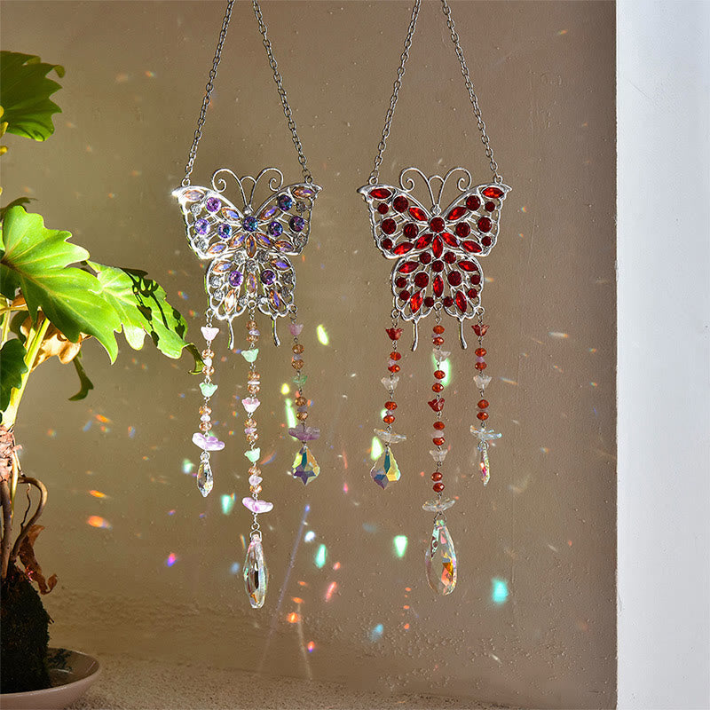 Butterfly Crystal Suncatcher wind chime is crafted with natural gemstones like Moonstone and Ruby Quartz. The delicate butterfly design paired with soft chimes promotes harmony and tranquility. Ruby Quartz is used for the red version, while Moonstone adds elegance to the other. Hang it in windows or outdoor spaces to catch sunlight, creating soothing reflections and gentle sounds.