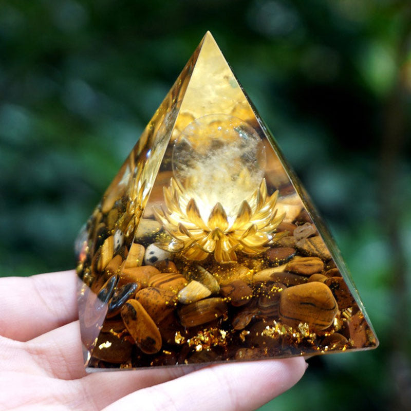 Throughout the life’s journey, you’ll sometimes find yourself in need of sources of positive energy and guidance. This Clear Crystal Tiger Eye Lotus Symbol Orgone Pyramid is a constant reminder that what is before you is greater than what you left behind; all you have to do is believe you have the power to continue to push forward.