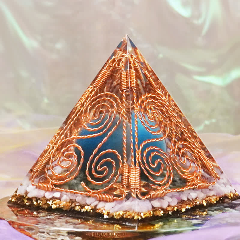 Copper Wire Triskelion orgone pyramid features a central blue Cat's Eye stone encased in a unique copper wire Triskelion design. Surrounding the crystal are Labradorite and Rose Quartz, both known for their powerful healing properties. Labradorite enhances intuition, while Rose Quartz promotes love and emotional healing. The pyramid shape channels energy to create a harmonious and balanced space.