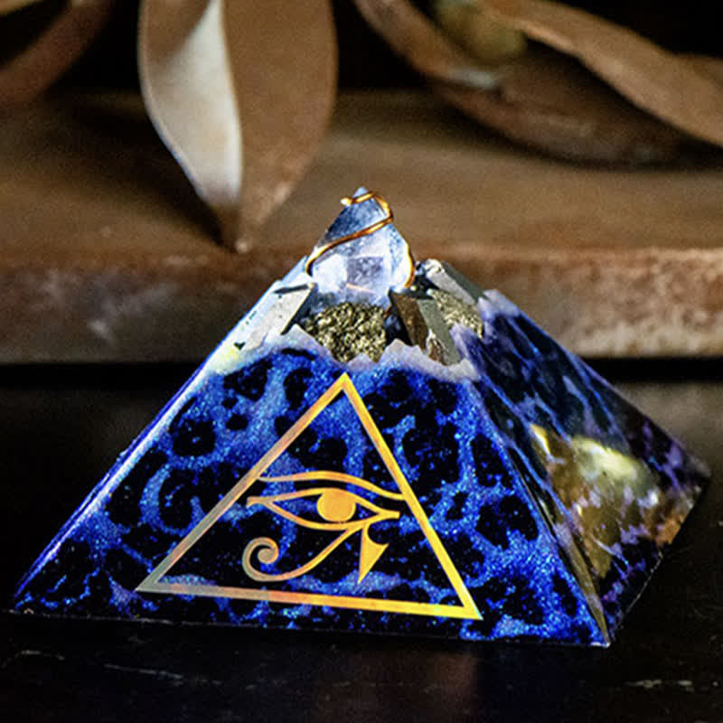 Eye of Horus orgone pyramid combines Clear Quartz for clarity and energy amplification with Hematite for grounding and protection. The Eye of Horus symbolizes spiritual insight and divine protection. This pyramid is thoughtfully crafted to align energies and promote a balanced, calming atmosphere, making it ideal for meditation, energy healing, or as a meaningful spiritual centerpiece.