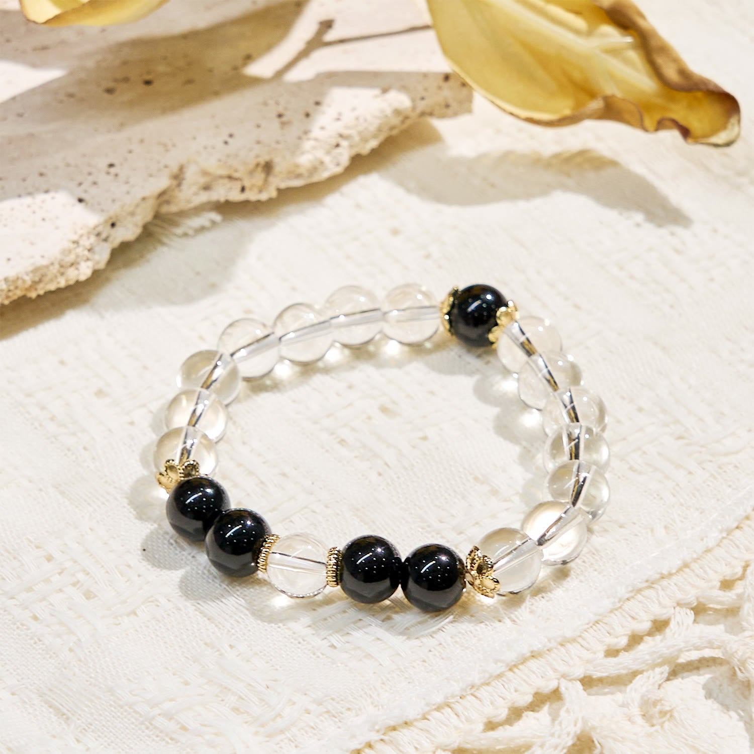 Inspired by the eternal dance of ocean, earth, and light, Harmony Breeze weaves clear crystal, aquamarine, and obsidian into a talisman of balance. Each luminous crystal bead acts as a prism, amplifying clarity and dissolving mental fog, while aquamarine—carrying the breath of ancient seas—soothes emotional tides with its tranquil blue whispers. Anchoring the design, polished obsidian beads ground restless energy like volcanic stone meeting shorelines, offering protective stability.