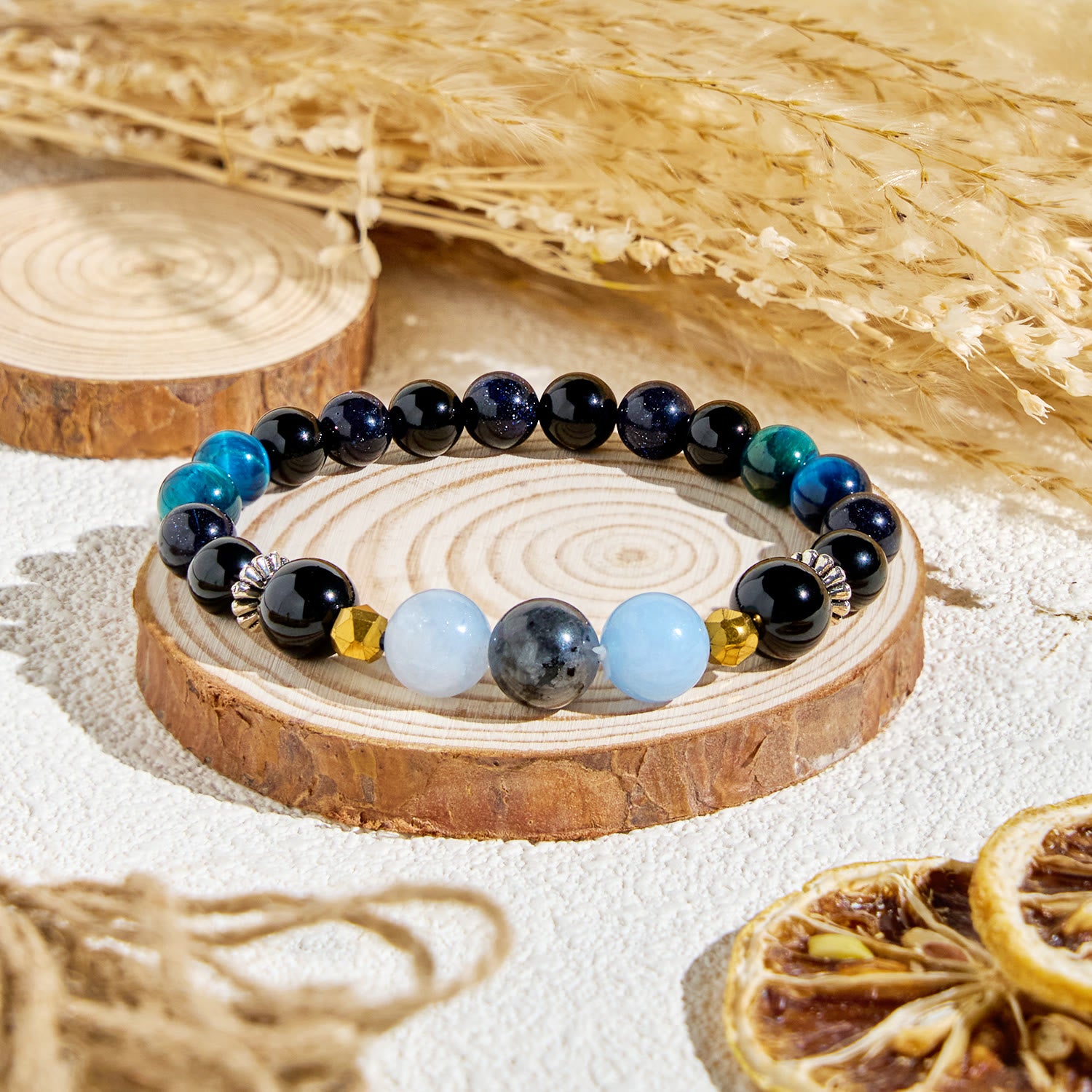 "Midnight Sky" adorned with Labradorite, Aquamarine, Obsidian, Blue Sandstone, and Blue Tiger Eye, mirroring the mystery of the night sky. Its stones are believed to channel calmness, protection, and positive energy—ideal for balancing daily life.