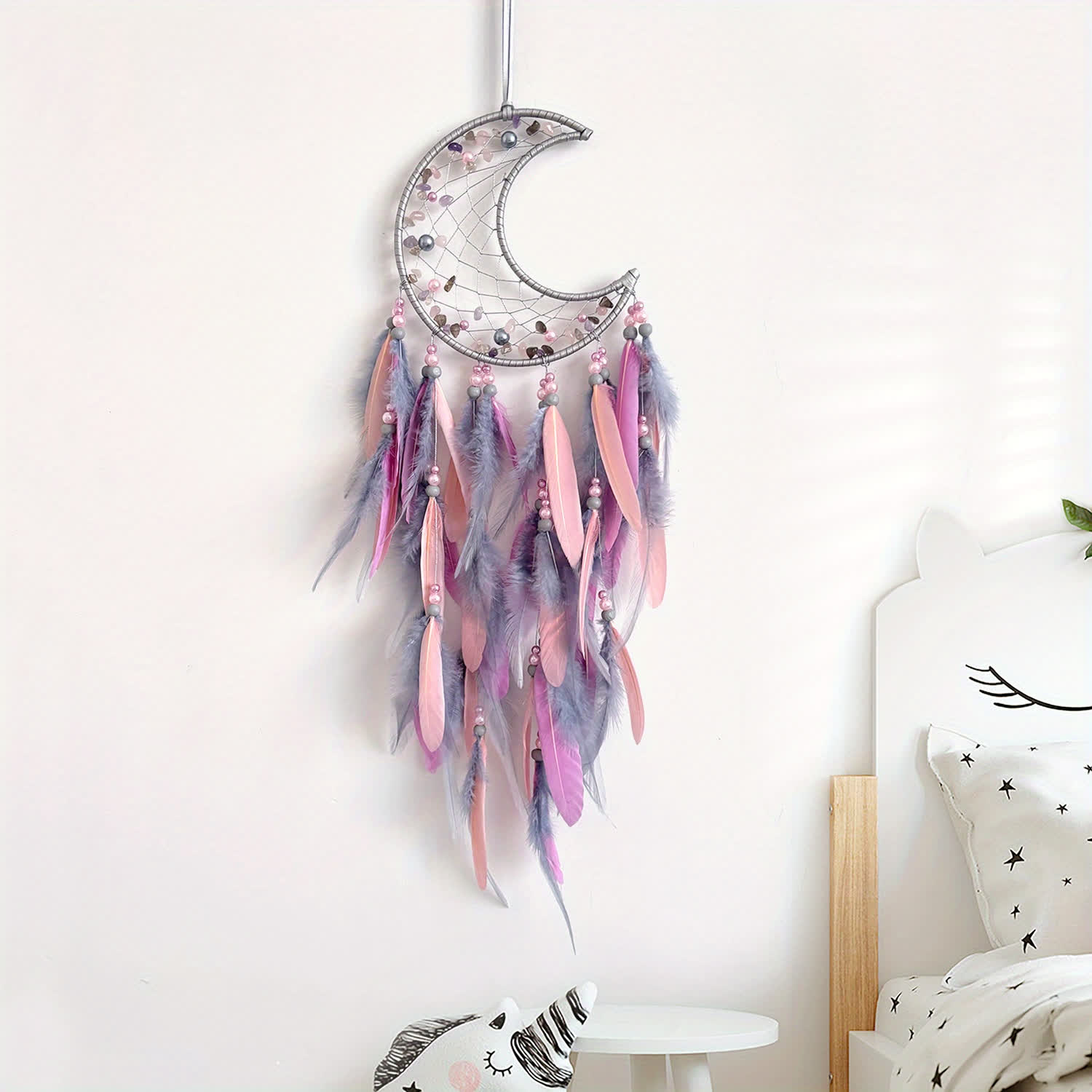 Moon Feather dream catcher is designed with a crescent moon shape, offering two feather options—purple and pink. It is adorned with crystals including amethyst, rose quartz, clear crystal, and smoky quartz, each known for their healing properties. The dream catcher symbolizes protection, spiritual harmony, and emotional balance, creating a peaceful, soothing energy in any space.