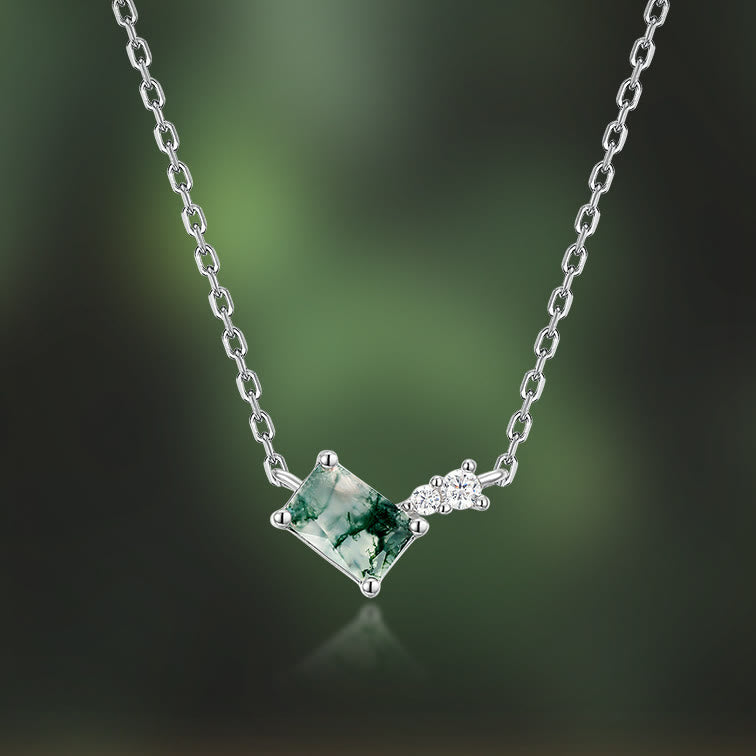 Rectangular Moss Agate necklace features a rectangular geometric pendant showcasing the natural beauty of moss agate. Known for its grounding and calming properties, moss agate promotes balance and personal growth. The geometric design symbolizes structure and stability, offering wearers a reminder of life’s harmony. Ideal for those seeking connection to nature and a meaningful accessory in spiritual journeys.