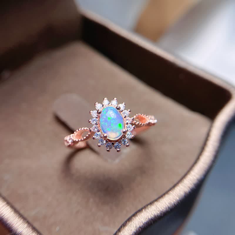 Opal White Zircon Sunflower ring presents a stunning design with an oval opal centerpiece encircled by white zircon, mimicking the beauty of a sunflower. The opal is known for its spiritual connection and inner clarity, while the zircon adds a touch of brilliance. This ring's harmonious design represents positivity and enlightenment, making it a meaningful accessory with both aesthetic and spiritual value.