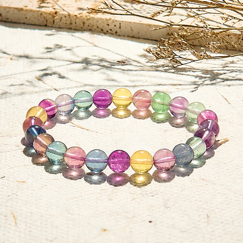 Natural Rainbow Fluorite bracelet showcases shimmering rainbow fluorite beads, celebrated for their grounding and intuitive properties. This bracelet promotes emotional clarity, dispels negativity, and encourages creative thinking. The multifaceted fluorite stone enhances spiritual alignment and positive energy flow, making it a meaningful accessory for achieving inner peace and a balanced mindset. Crafted with high-quality materials, it offers symbolic and energetic benefits.