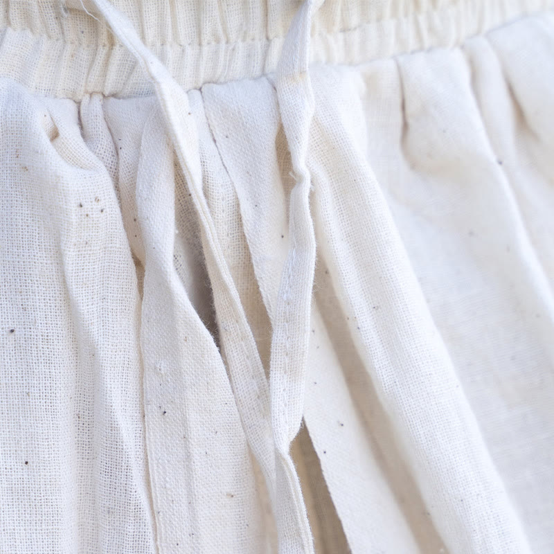 Find your effortless summer staple! Crafted from soft, breathable linen in a versatile cream hue, these pants offer pure comfort. Featuring an elastic waistband with an adjustable drawstring, they ensure a perfect, relaxed fit. With wide legs gently folding into a gathered ankle or flowing freely, the silhouette is effortlessly elegant.
