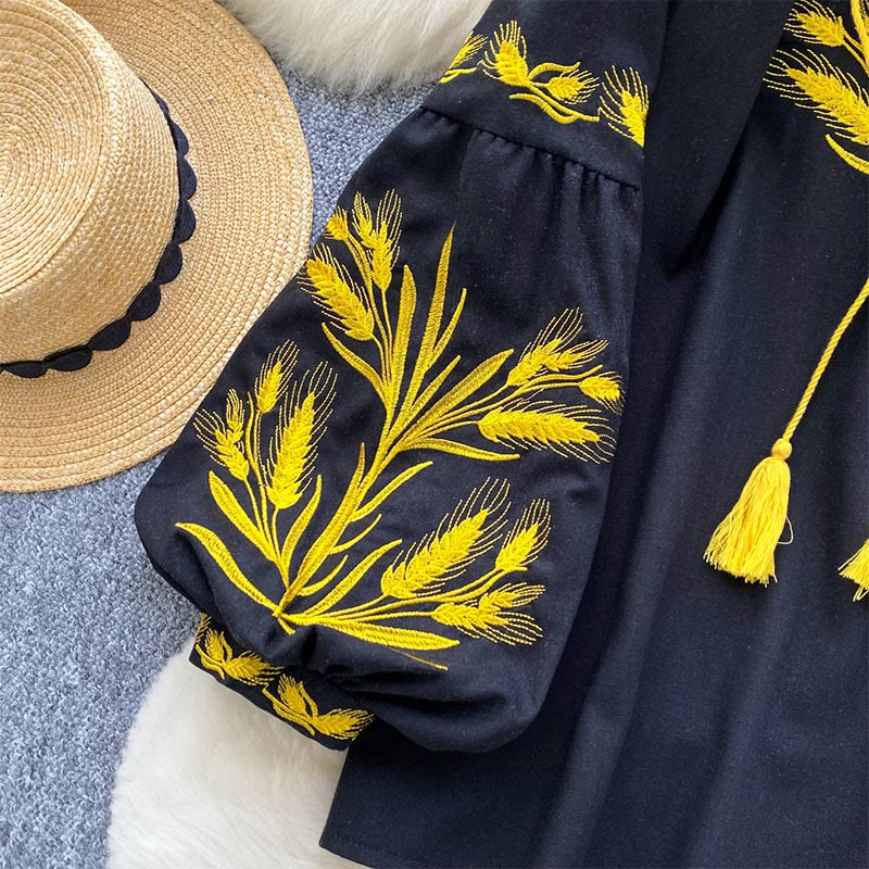 Inspired by golden harvests and rustic serenity, the Golden Wheat Ear Embroidery Women's Shirt captures the essence of nature's quiet strength. 🌾✨ Made from a breathable cotton-linen blend, this one-size blouse features intricate wheat ear embroidery across the front, complemented by a soft round-to-V neckline with a drawstring and flowing lantern sleeves for a gentle, graceful silhouette.