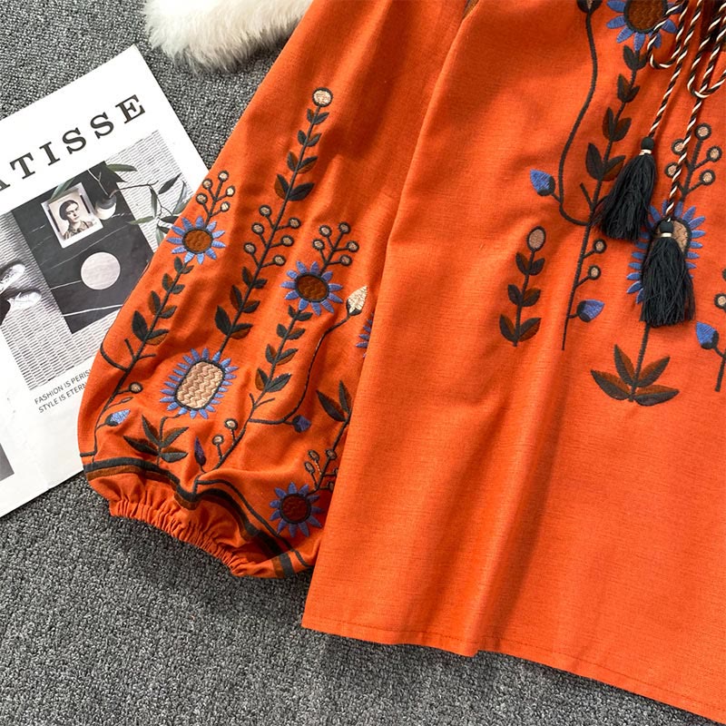 Step into timeless charm with the Pastoral Flower Embroidery Lantern Sleeve Women's Shirt. Made from a breathable cotton-linen blend, this blouse offers a perfect balance of softness and structure. The round neckline flows into a flattering V-shape with a delicate drawstring tie, while the voluminous lantern sleeves add an airy, romantic touch. 🌼🌿