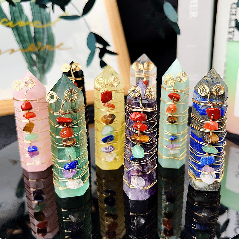 Seven Chakra Crystal tower combines the resonant energies of seven unique crystals to align and stabilize the body's energy centers. Geared towards meditation and energy healing, this wire-wrapped tower acts as a visual and energetic guide to spiritual growth and harmony. Its pointed design focuses energy, making it a practical and aesthetically pleasing addition to any space dedicated to spiritual or healing practices.