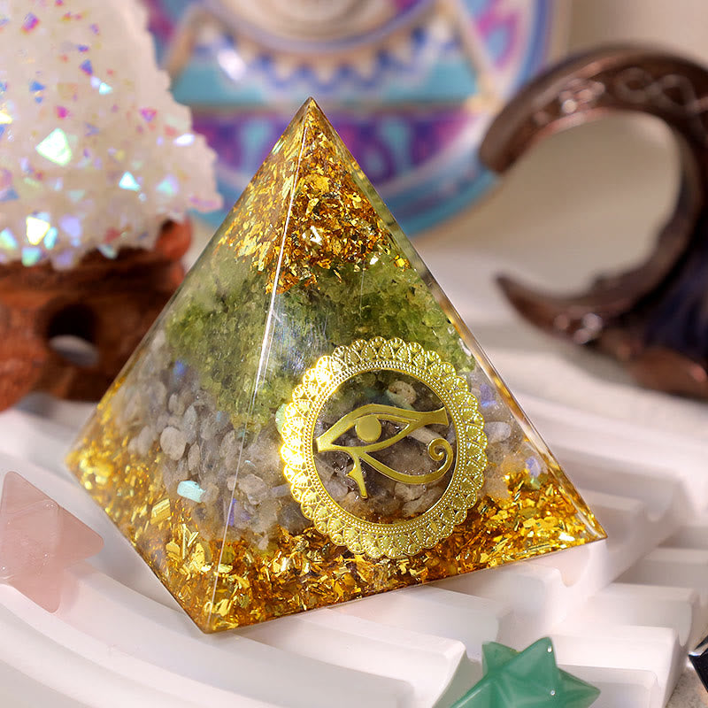 - Name:Olivenorma Prehnite Moonstone Eye Of Horus Orgone Pyramid