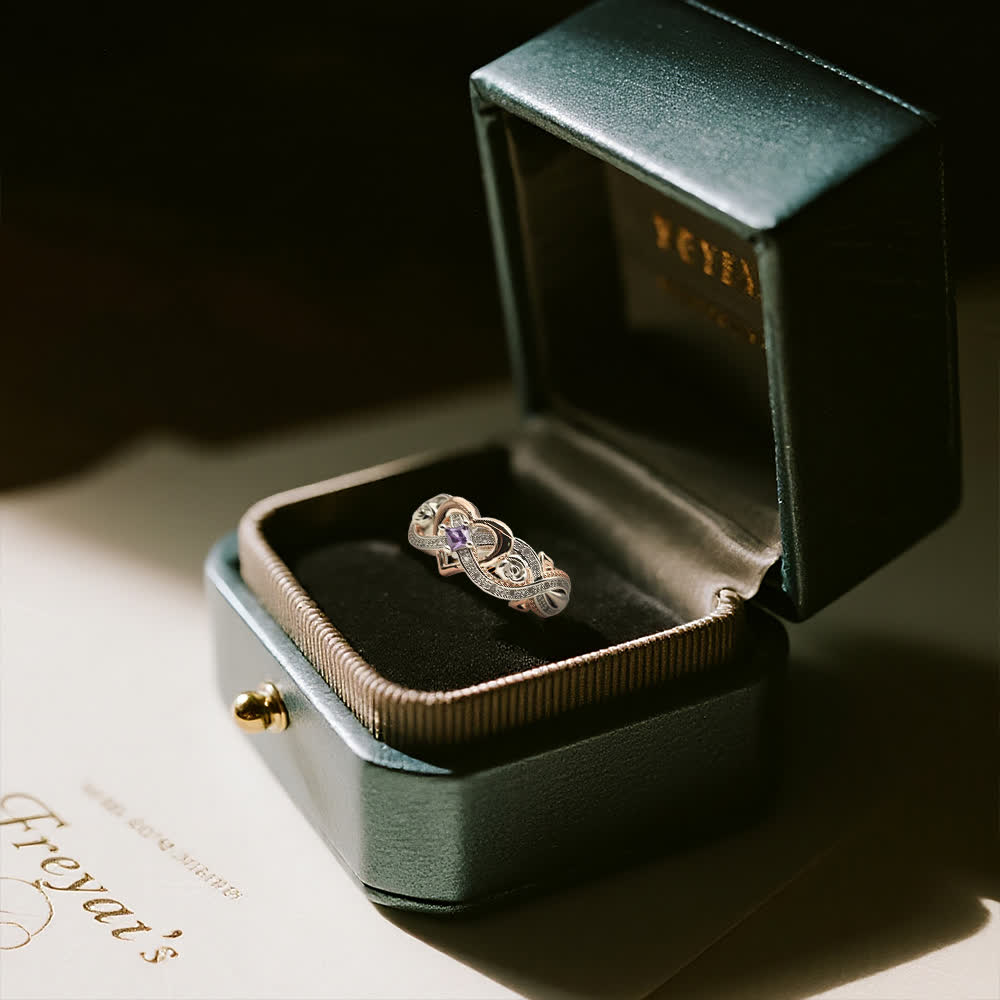 - The Freyja’s Heart Amethyst Love Ring is a captivating blend of elegance and Norse mythology. Its delicate rose gold band intertwines with shimmering cubic zirconia stones, cradling a radiant purple gemstone at its center—a tribute to Freyja’s grace and resilience. Designed for women who value strength and beauty, this ring is a timeless reminder of love's enduring power.