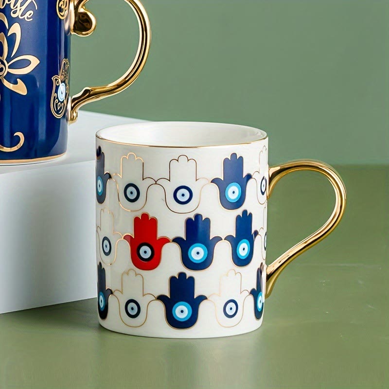 Evil Eye Pattern Ceramic cup combines a vivid Evil Eye and Hamsa design with a luxurious gold handle. Crafted from durable ceramic, this cup provides both spiritual protection and visual appeal. The gold handle adds a touch of elegance, while the ceramic construction ensures lasting quality. Ideal for tea or coffee, this cup brings both beauty and meaningful symbolism to your daily routine.