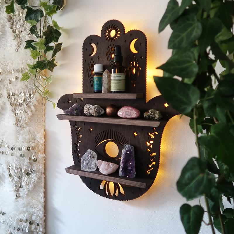 Protect your home and your trinkets from negative energies with this Hamsa Hand Protection Crystal Shelf. This gorgeous poplar wall-hanging shelf is shaped like a Hamsa, a Middle Eastern symbol created to ward off the Evil Eye. It can hold and charge your crystal collection, tarot cards, and any other small items with ease, all the while improving the energy flow of your home.