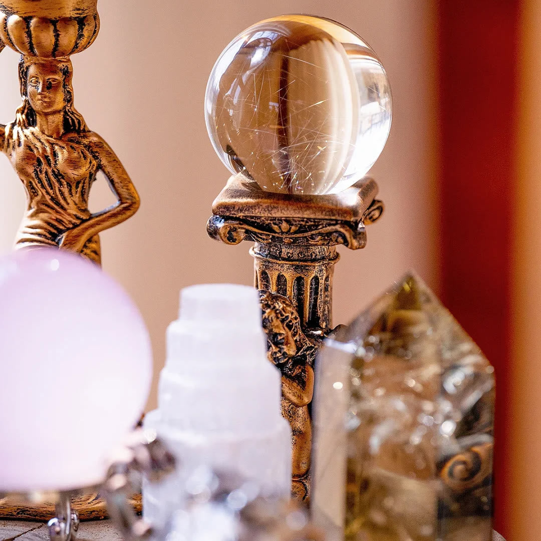 - Clear Crystal Set: 3 Clear Crystal balls, 1 Rose Quartz ball, 1 Amethyst tower spire, 1 Clear Crystal column, 1 faceted Amethyst, 1 Selenite Crystal, 3 pieces of faceted Clear Crystal, 1 Orgone Pyramid, a Purification Set and Solid Wooden Base.