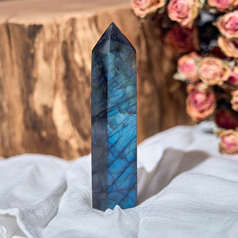 Faceted Labradorite crystal wands tower features exquisite polished surfaces that display the stunning play of colors characteristic of labradorite. Known for its powerful metaphysical properties, this crystal supports intuition, transformation, and spiritual growth. The pointed design focuses energy, making these wands perfect for meditation, energy healing, and intention setting. Labradorite's protective qualities help shield the aura while promoting self-discovery.