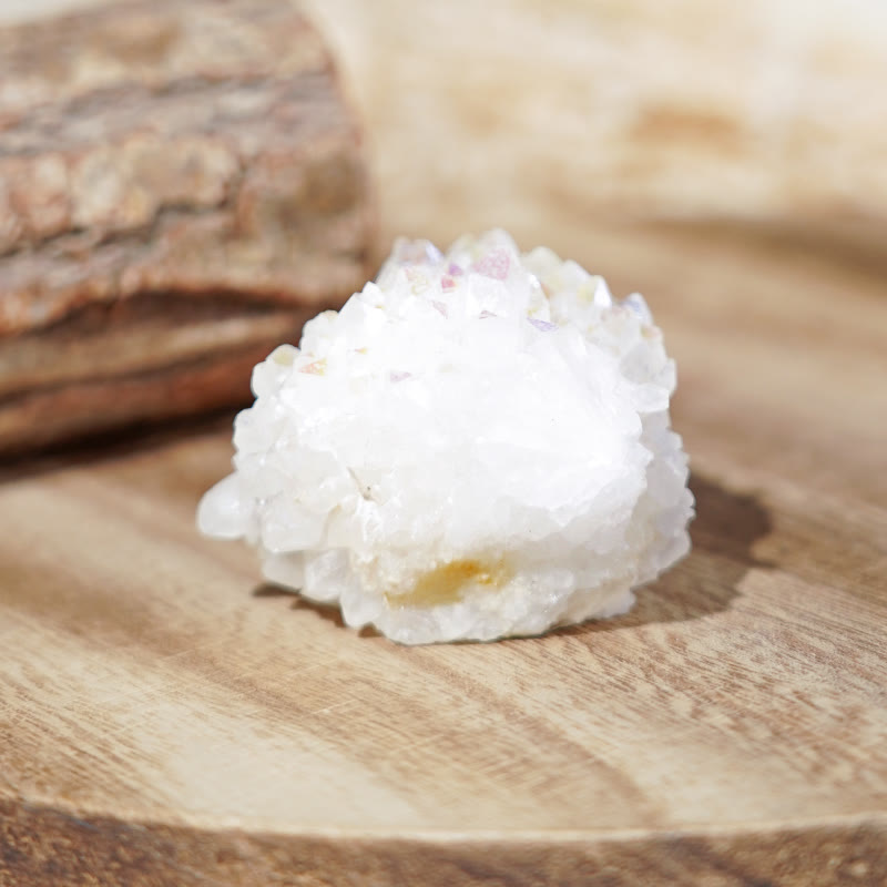 Angel Aura Quartz crystal cluster features natural geode formations with iridescent layers, reflecting calming energy for emotional balance and spiritual clarity. Known for connecting the mind and spirit, this crystal cluster aids in meditation, creating a peaceful, positive space. Its beautiful spectrum of colors inspires harmony, making it ideal for relaxation, mindfulness, and restoring tranquility to personal spaces or sacred environments.