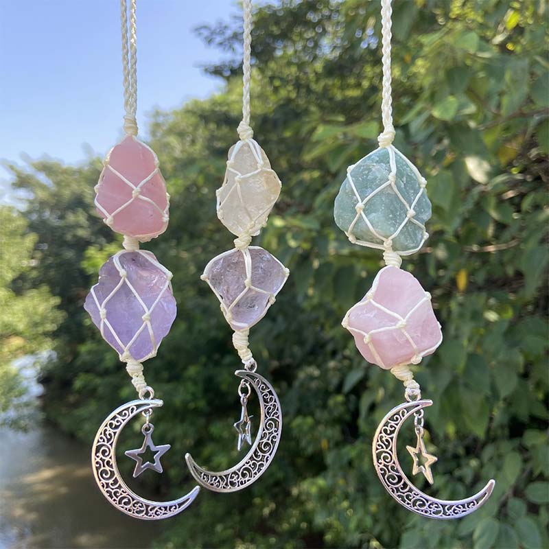 These Natural Crystal Stone Moon & Star Symbol Wind Chimes channel the energies of the world around them, calling in the wild spirit of nature to your own private space whether you live on a large plot of land or in a small city apartment. These hanging wind chimes are the perfect addition to any garden, patio, balcony, or outdoor space. The braided white ropes channel universal energy down through two crystals of your choice – Amazonite and Pink Crystal, Amethyst and Citrine, or Amethyst and Pink Crystal – and into the hanging Moon and Star charms, invoking their powers and blessings in the surrounding space.