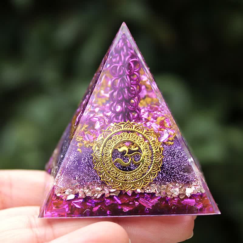 Amethyst Stone orgone pyramid is designed with a golden Om symbol on the surface, representing spiritual wisdom and universal energy. Amethyst at the pyramid's core promotes peace and emotional healing, while the metal wire enhances energy flow. This pyramid is an ideal tool for creating a balanced environment, aiding in meditation, and protecting against negative influences.