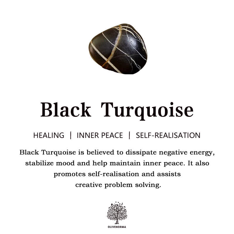 Black Turquoise dispels negative energy, stabilising mood swings and instilling inner calm. It is excellent for depression and exhaustion, and it has the power to prevent panic attacks. Black Turquoise also promotes self-realisation and assists creative problem solving.