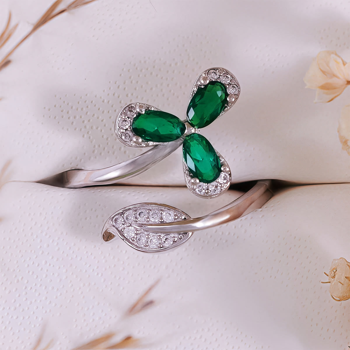 - Name: Olivenorma Emerald White Zircon Clover Adjustable Ring