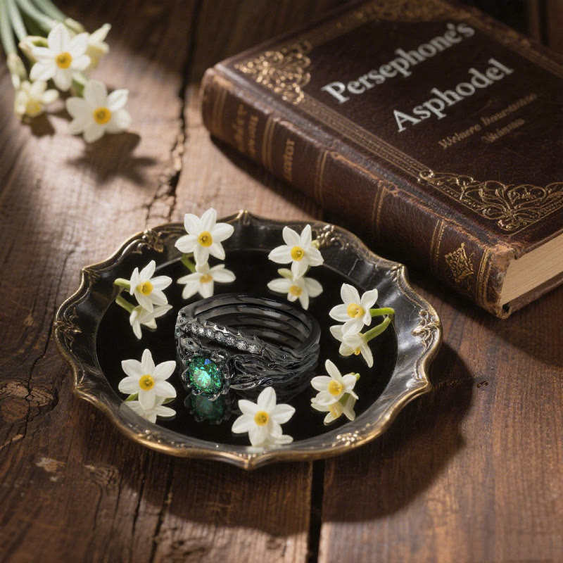 In the realm where sunlight never treads, Queen Persephone walked the Asphodel meadows of the Underworld. These pale, resilient flowers—the only blooms in the land of shadows—whispered tales of souls who endured darkness yet clung to hope. When spring called her back to the mortal world, she plucked one Asphodel root, fused it with an emerald born of Earth’s rebirth, and bound it in black vines forged in the Styx’s depths.