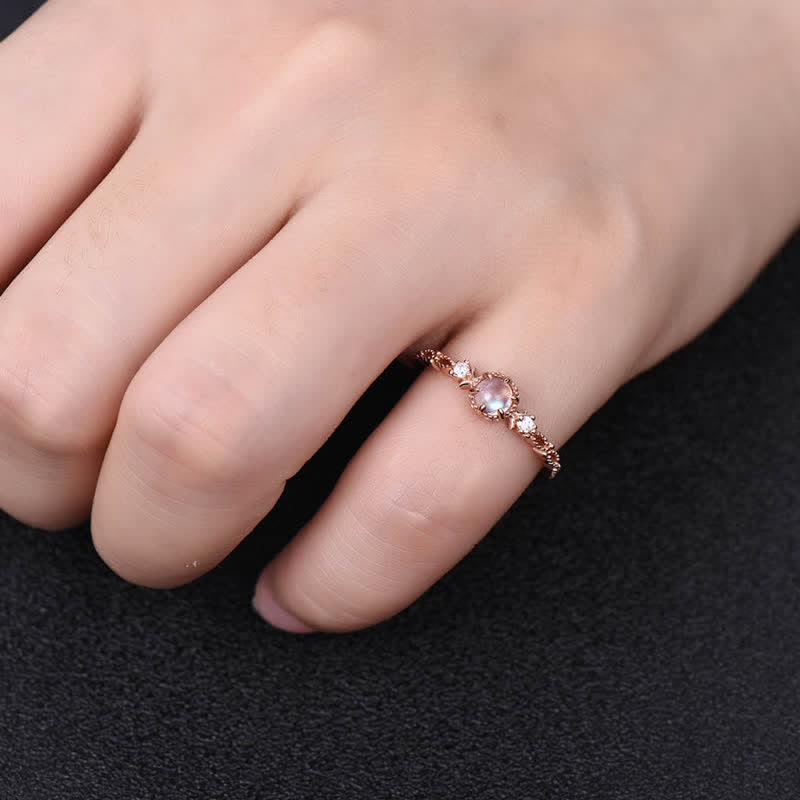 Moonstone Engagement ring features a captivating round moonstone, securely held by six delicate claws. Two smaller white zircons grace each side, adding a touch of sparkle. This minimalist yet elegant design allows the moonstone's iridescent beauty to take center stage. Moonstone, is said to enhance intuition, promote emotional balance, and bring good fortune to new beginnings.