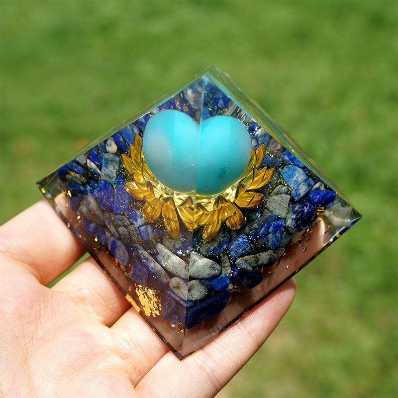 Turquoise is a therapeutic powerhouse of a stone. It enhances positive thinking and cultivates happiness through its warm and gentle vibrations. Have this Orgone Pyramid at hand when you meditate to increase the soothing effects. Turquoise can open your heart to universal love and make you experience this emotion in its highest form.Healers associate the healing powers of Turquoise primarily with the Throat or 5th chakra. It can also benefit the operation of the Heart Chakra by opening it up for giving and receiving love.