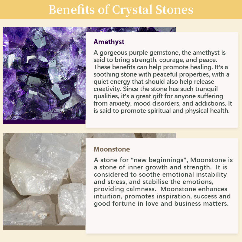 With its alternating amethyst and moonstone spheres and its added copper charms, this Amethyst with Moonstone Lucky Gemstone Bracelet will remind you that the power of the moon shines above you always. Even on pitch black nights, the moon lights your path. This bracelet’s added moon charm ensures that illusions and mysteries will be unveiled before you because the truth always comes to light; sometimes, it just takes a little extra time.